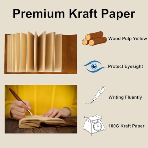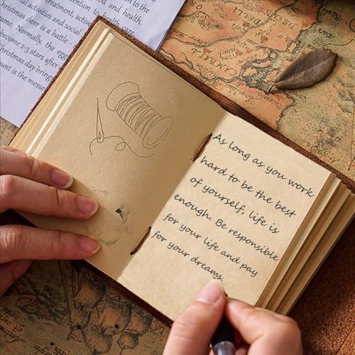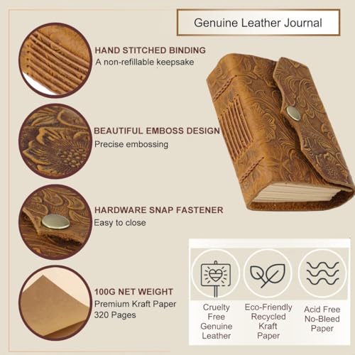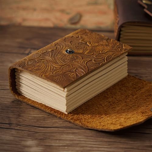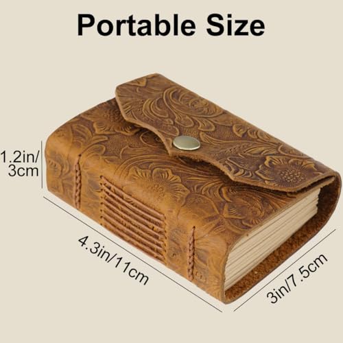 KASTWAVE Leather Bound Journal, 4.3"X3" 320 Pages Kraft Paper Office Notebook Mini Handmade Unlined Leather Sketchbook, Vintage Embossed Travel Journal, Gift for Women Men, Brown