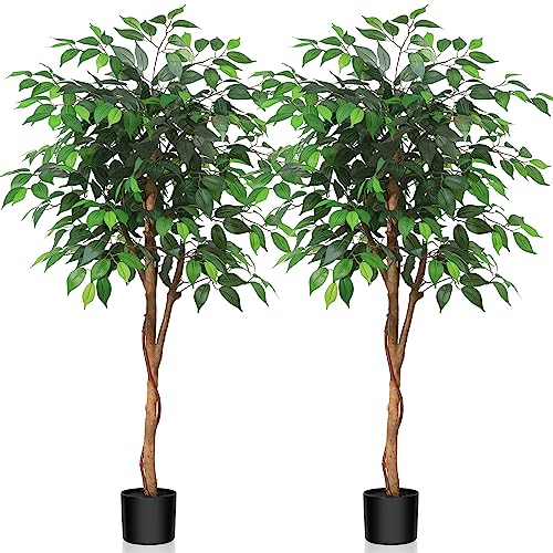 Kazeila - Kazeila 4 Feet Artificial Ficus Tree - Fake Silk Plants with Lifelike Leaves and Natural Wood Trunk - Faux Potted Tree for Indoor Home Decor - 2 Pack