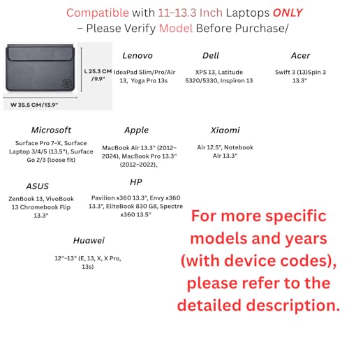 - Compatible Devices: MacBook Air 13.3" (A1466, A1932, A2179, A2337), MacBook Air 13.6" (A2681, A3113), MacBook Pro 13.3" (A1502, A1708, A1989, A2251, A2338), MacBook Pro 14" (A2442) MateBook E 12", 13"/13s, X/X Pro 13.9", 14s, D14 Surface Pro 7/8/9/10/X (12.3–13"), Laptop 13.5", Go 2/3 (10.5", loose fit) Xiaomi Air 12.5", Notebook Air 13.3", Pro X 14, RedmiBook 14 MagicBook 14/V14/X14 IdeaPad Slim 13, YOGA Pro13s, Air14 Plus, Pro14 Ryzen, Air14 R5 XPS 13, Latitude 5320/5330, Inspiron 13/14 Pavilion x360, Envy x360, EliteBook 830 G8, Spectre x360 13.5" ZenBook/VivoBook 13–14", Chromebook Flip Swift 3, Spin 3, Chromebook 14