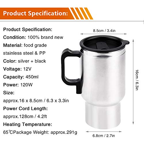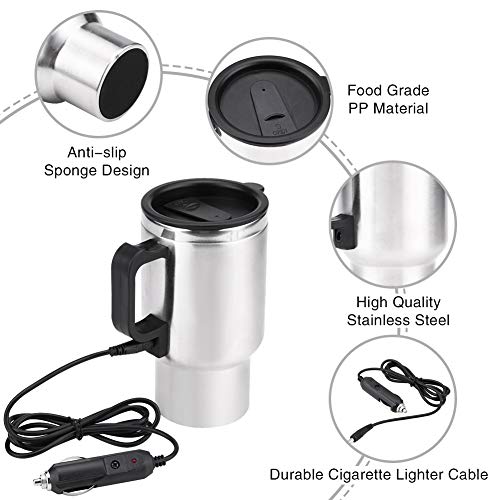 Keenso - كوب تسخين كهربائي مصنوع من الستانلس ستيل للسيارة 450 مل و12 فولت، غلاية معزولة كهربائية بمقبس، مج قهوة للتسخين وولاعة سجائر في السيارة مع محول