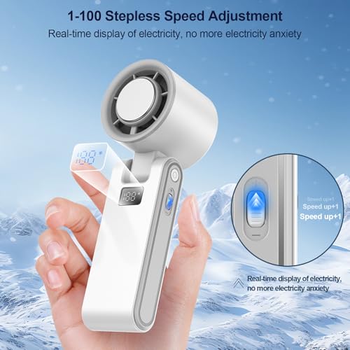 - 【سرعة قابلة للتعديل 100 درجة ورياح قوية】توفر مروحة اليد المحمولة القابلة لإعادة الشحن 100 سرعة بدون خطوات. يمكنك تخصيص سرعة الرياح وفقًا لمشاعرك واحتياجاتك. يتيح لك القرص الدوار البديهي ضبط سرعة الرياح بدقة من اللطيفة إلى التوربو. مثالية لكل من المستخدمين من النساء والرجال أو احتياجات مروحة اليد الشخصية. (يرجى ملاحظة ما يلي: تعمل المروحة لدينا بهدوء بسرعات منخفضة، وبعض الضوضاء بأعلى السرعات.)