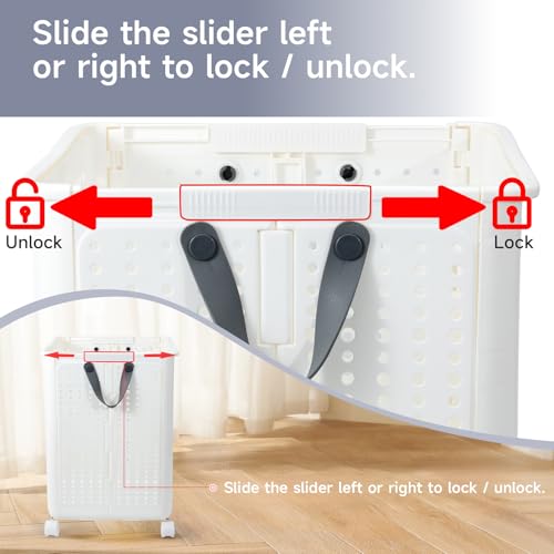 - [Foldable] This laundry cart with wheels is foldable. When in use, open the folded wall, lock the push-pull buckle at the top, and then press the bottom plate to buckle the card slot. When not in use, fold the bottom plate and release the top push-pull buckle to fold the laundry basket plastic into a pop-up hamper with a width of only 3.5 inches. It does not take up space no matter where it is placed.