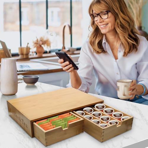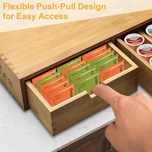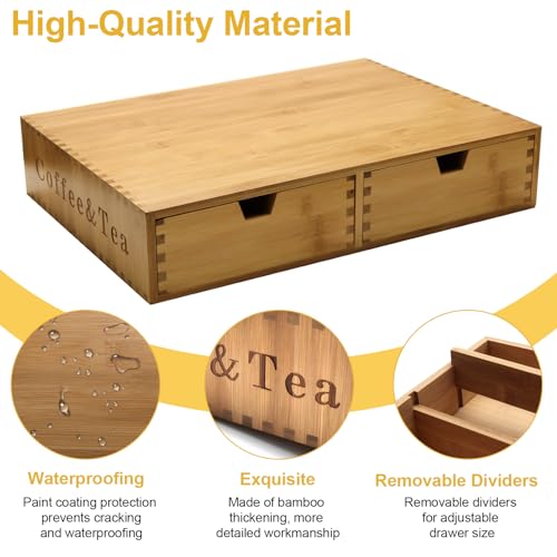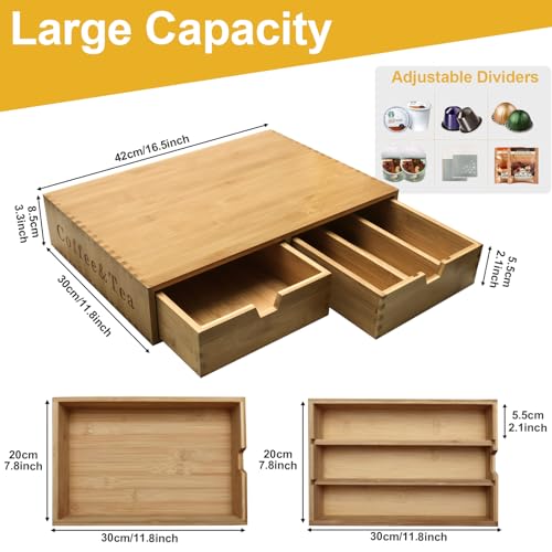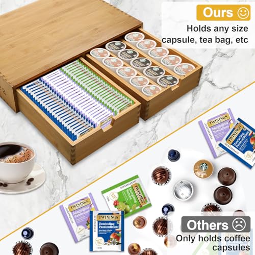 - 【Ultra Large Capacity】This coffee pods holder can hold various types of coffee packaging.One drawer with dividers allows you to organize coffee capsules in an orderly manner, and the other side of the drawer without dividers can hold larger packaging such as tea bags and coffee bags.