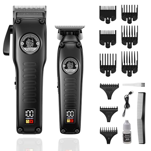 KEMEI - ماكينة حلاقة الشعر الاحترافية 1827 للرجال، ماكينة تشذيب اللحية الكهربائية مع شفرة على شكل حرف T بدون فجوة، مجموعة مقصات وتشذيب لاسلكية مع شاشة ال اي دي لهدايا الرجال من كيمي
