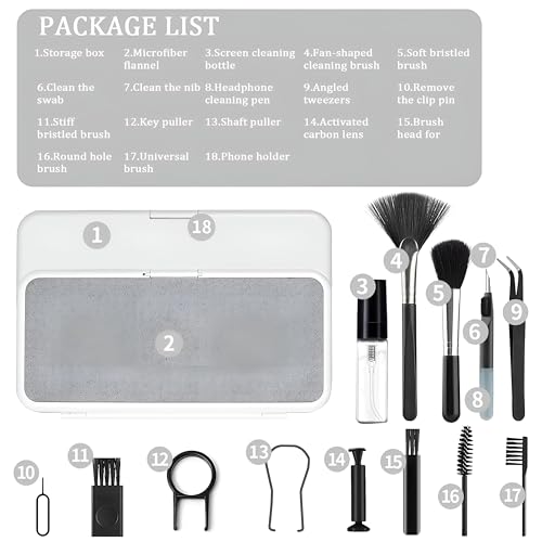 • computer keyboard cleaning kit: this cleaning kit includes helmet cleaning pen, storage box, super fibre velvet, rod extractor, key extractor, needle pickup, activated carbon lens pen, hard brush, universal brush, round hole brush, cleaning spray bottle (vacuum), fan cleaning brush, angle tweezers, cleaning tip, plant brush head, cotton swab cleaning, soft brush, mobile phone holder.