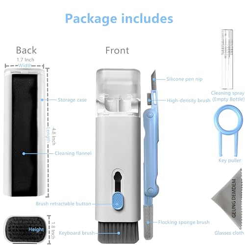 - GREAT for CLEANING:Multifunctional 7-in-1 electronic cleaner kit can not only clean the dirt in the gap of device, but also clean the screen.Product includes cleaning pen tip,high-density brush,flocking sponge,keyboard cleaner brush, cleaning flannel,keycaps puller,microfiber cloth,cleaning spray bottle