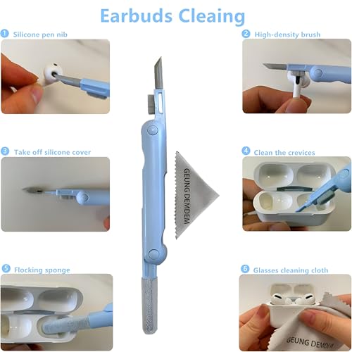 - USER INSTRUCTION:More details about user instruction refer to video or description.Silicone pen tip-Clean the speaker of the your earbuds.ABS pen tip-Clean the gap of device.High-density brush-Clean the mesh on earbuds or phone.Flocking sponge-Clean the hole of earphone charging case.Keycaps puller-Pull off the trapezoidal keycaps of computer keyboard. Keyboard cleaning brush-Clean the crevices of keyboard.Cleaning flannel and microfiber cloth-Clean the screen of your device