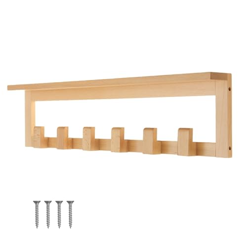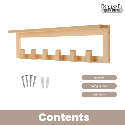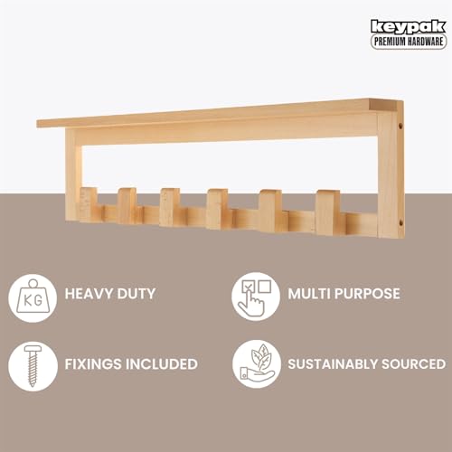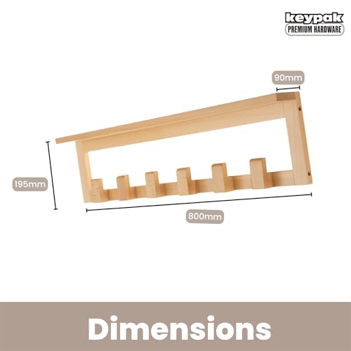 Keypak - كي باك رف معاطف من خشب الزان مع رف، 68 سم يثبت على الحائط 6 خطافات، رف تخزين خشبي بالكامل