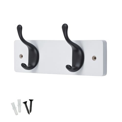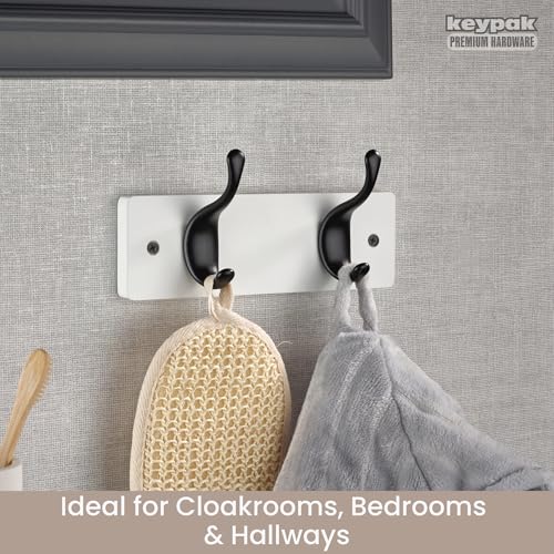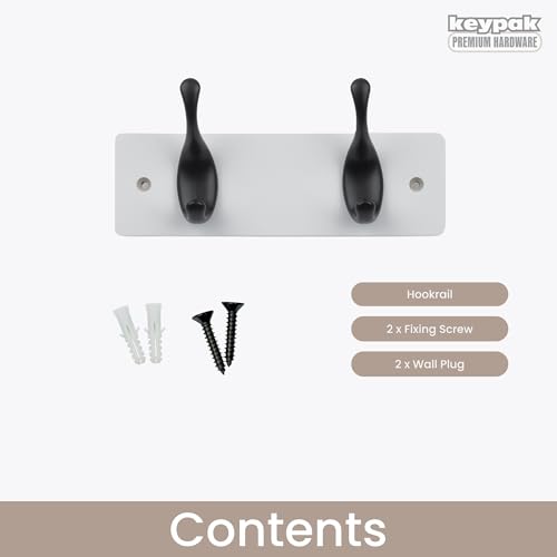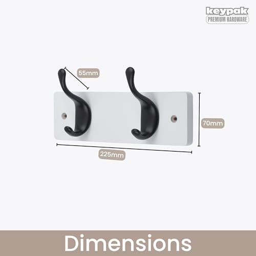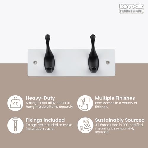 Keypak - Modern Wall Mounted Coat Rack, Matte Black Hooks on Wood Base (White/Matte Black, 2 Hooks)