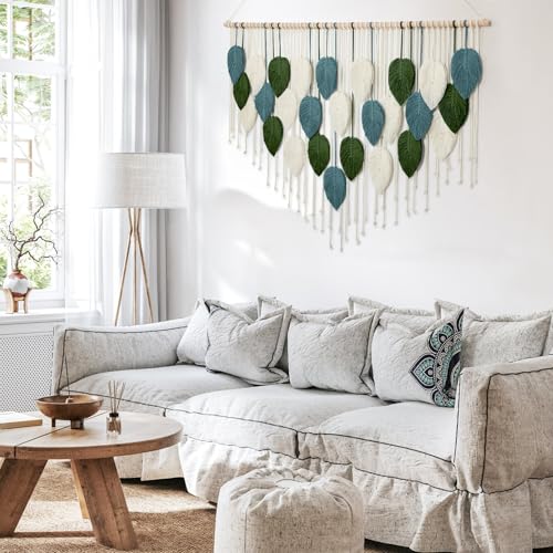 - 【Bohemian Home Decorations】The unique bohemian style wall decor features a beautiful blend of three colors: green, cyan and beige. The elegant long tassel details and macrame leaf weaving design make it a stunning piece of wall decor, adding a distinctive touch to any living space. Using our stunning boho tapestry will immediately change the vibe of your room, perfect for creating an elegant and bohemian atmosphere in your home.