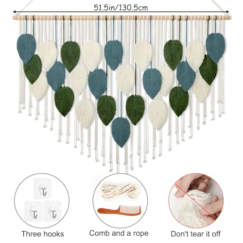 - 【large Wall Decor】A large leaves macrame wall hanging of 51.5" W X 33.5" L, great fit for your home wall. The package includes four spliced wooden sticks, which can be easily pieced together to form a large woven tapestry. Whether paired with a modern minimalist style or bohemian style, the aesthetic wall art is a one-of-a-kind piece and will creat a warm and outstanding home atmosphere.