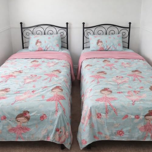 Generic - غطاء لحاف أطفال بتصميم راقصة الباليه، قطن عامرية، أزرق وردي، 180×240 سم مع خدادية 50×70 سم، مزود بسوستة