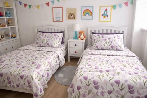 Generic - Kids Duvet Cover Set, Purple Flower Pattern, 180x240 cm, 2 Duvet Cover and 2 Bed Pillowcases, with Zipper