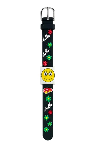 Generic - Kids Fashion Belt with Emoji and Floral Design, Black Leather, Decorative Smiley Face Pattern, Red and Green Flowers