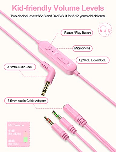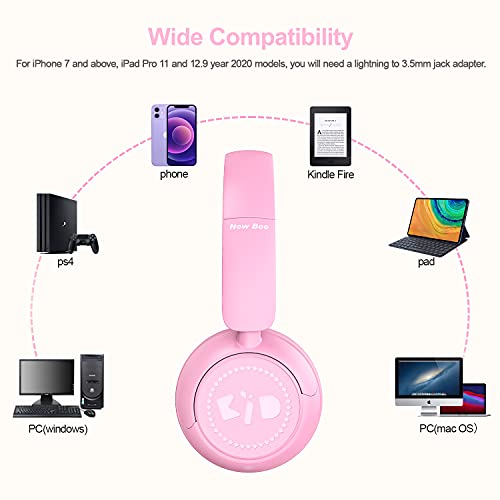 New Bee - Kids Headphones for School with Microphone New bee HD Stereo Safe Volume Limited 85dB/95dB Foldable Lightweight On-Ear Headphone for Boys/Girls/PC/Kindle/Tablet (Pink)