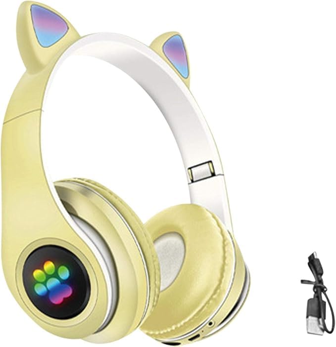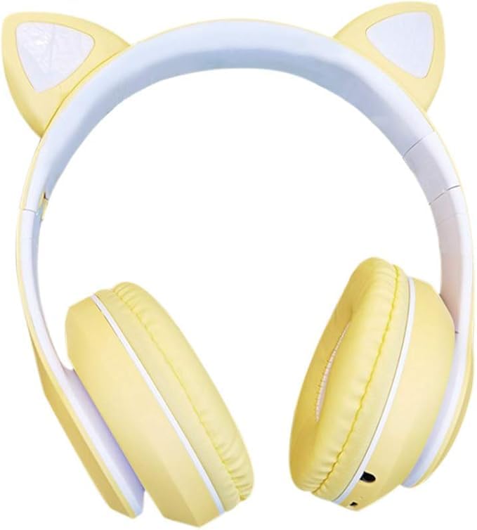 Generic - سماعات راس للاطفال سماعة لاسلكية للالعاب بتصميم اذن قطة بلوتوث قابلة للطي باضاءة LED فوق الاذن تحديد مستوى الصوت راديو اف ام بطاقة تي ميكروفون والكبار لون بيج