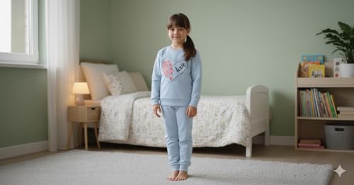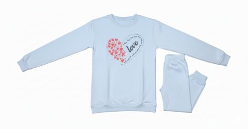 Generic - Kids Heart Print Pajama Set, Light Blue Cotton Long Sleeve Top and Pants, Cozy Love Theme Loungewear