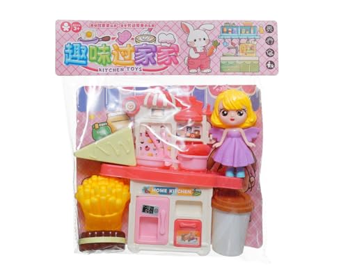 - Kids kitchen set includes plastic fruits, knife, cutting board and serving dish.