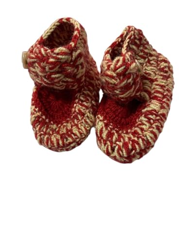 Generic - حذاء منزلي محبوك للأطفال، أحمر وبيج، نمط مخطط، بزر ذهبي، دافئ ومريح _ من خيوط الصوف التركي الناعم