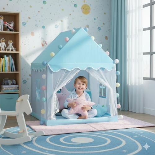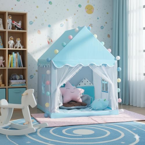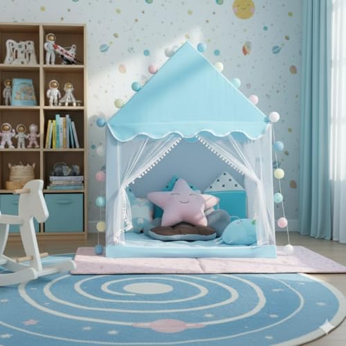 Generic - Kids Play House Tent, Indoor Design with Windows and Curtains, Star Decor (Blue)
