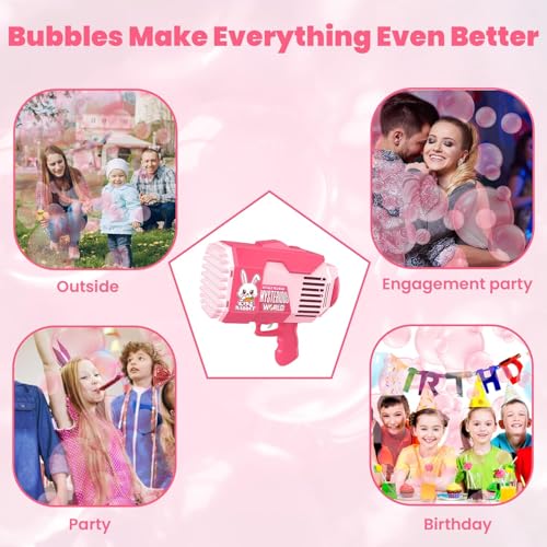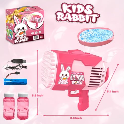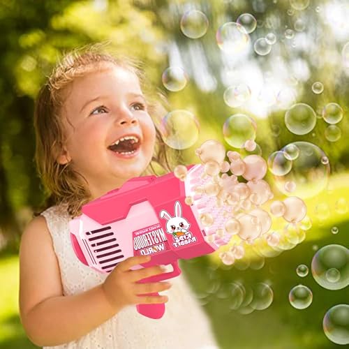 - مزايا التصميم: مسدس فقاعات وردي مع 73 فتحة للحصول على أقصى قدر من إخراج الفقاعات، يتميز بتصميم كرتوني لطيف على شكل أرنب مثالي لتسلية الأطفال.