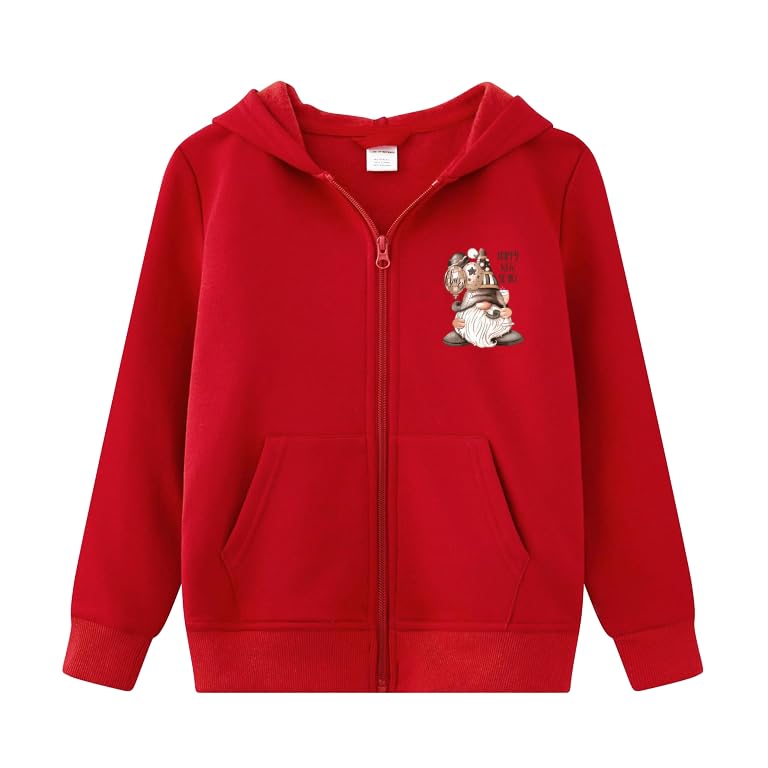 Generic - Kids Red Zip-Up Hoodie with Gnome Design, Cotton Blend Sweatshirt, Front Pockets, Casual Winter Wear(2XL)