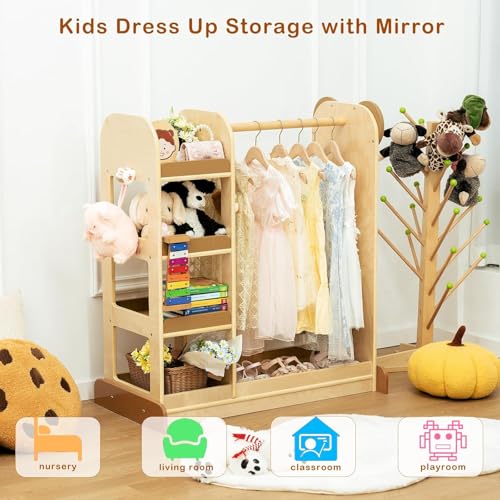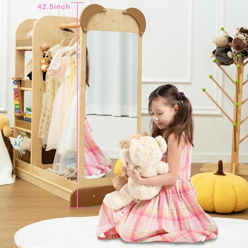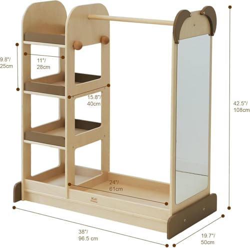 - Huge Storage Space: Kidi House kids costume organizer has a sturdy rod for hanging clothes and costumes, while the four-tier shelves can easily accommodate your child's favorite dress-up accessories. It has a shatterproof acrylic mirror on one side and a ball hook for bags on the other