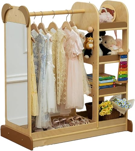 Generic - Kids Wardrobe Dress Up Toddler Pretend Storage Closet Clothes Rack with Mirror Organizers and Storage Montessori Furniture Large Storage Space Birch Plywood Natural