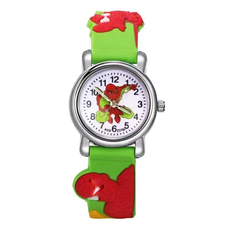 Generic - ساعة يد للأطفال مع حزام سيليكون اخضر ، تصميم مناسب للاولاد ، مينا بيضاء، إطار فضي