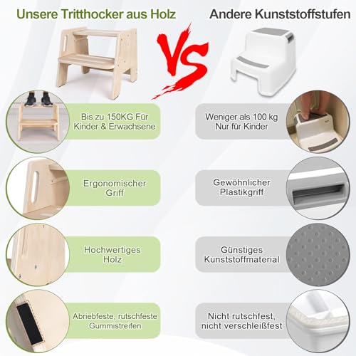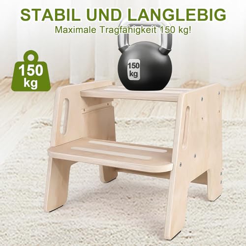 - Robust and stable: Our footstool made of high-quality solid wood, has an A-structure and is reinforced to ensure stability and durability and ensure that it does not wobble when your child stands on it. The steps are wide and sturdy enough and provide good grip. Our children's bathroom stool has a super load capacity of up to 150 kg, is stable and reliable and is suitable for shared use by children and adults.