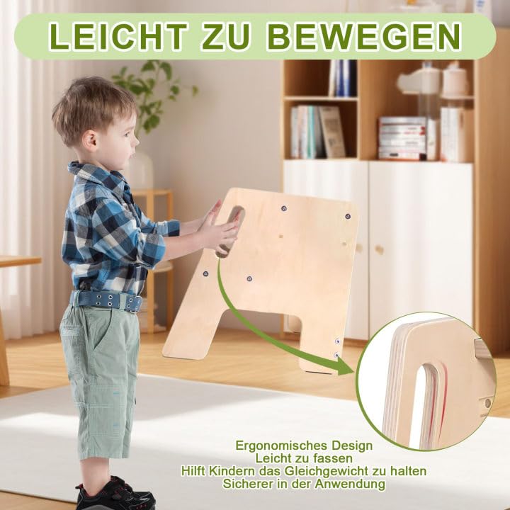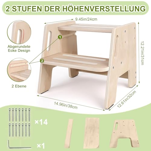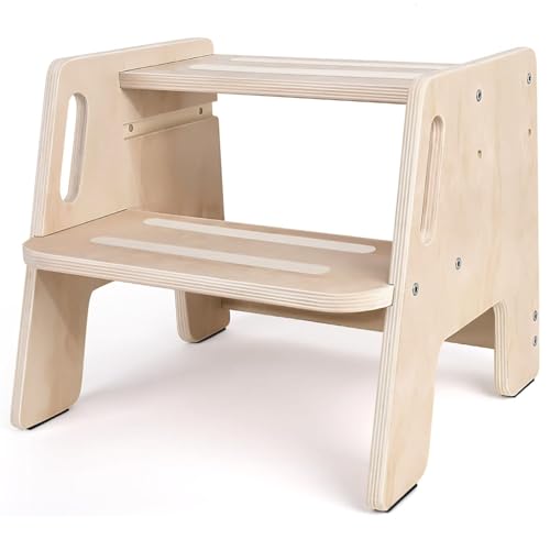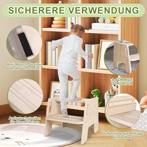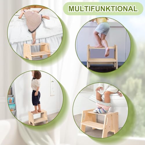 - Carefully designed: Our children's footstool has handles on both sides that are ergonomically designed to allow easy gripping, help children maintain balance and make use safer. The step height of the wooden stool is freely adjustable. You can easily adjust it to the size of your child and the usage needs. This is very practical.