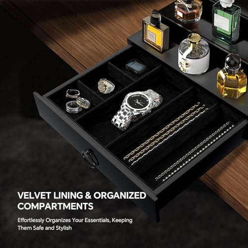 - 【Velvet-Lined Drawer with Dividers】A soft velvet-lined drawer of cologne stand protects your accessories from scratches. Built-in dividers help you neatly organize rings, watches, or cufflinks.