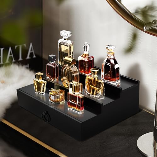 KISENG - Cologne Organizer for Men, 3 Tier Cologne Stand with Perfume Organizer Drawer, Perfume Holder with Hidden Compartment, Fragrance Stand Shelf A Great Gift for Man, Black
