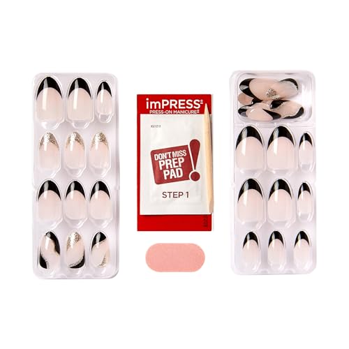 imPRESS - اظافر امبريس No Glue Mani بالضغط "الوهم" الفرنسية من كيس، لون محايد داكن + طرف اسود، حجم متوسط، شكل لوز، مع 30 وسادة اعداد للاظافر، ورقة تعليمات، 1 عصا مانيكير، 1 مبرد صغير