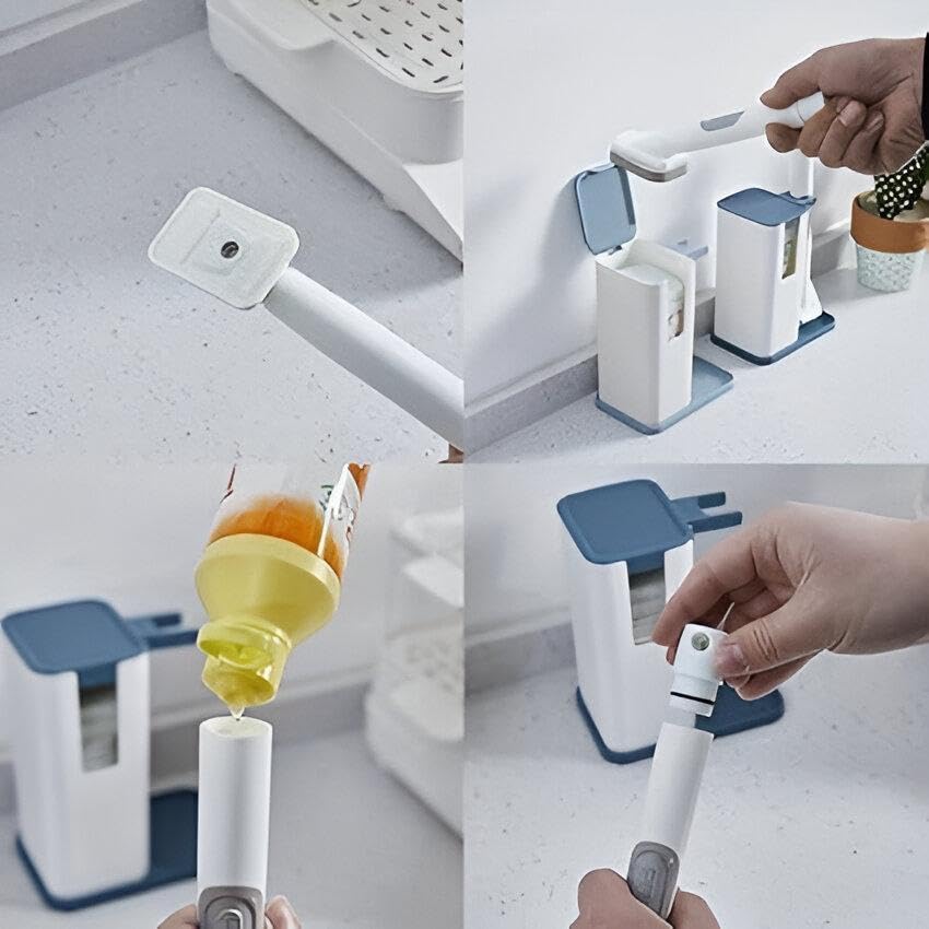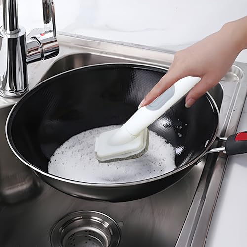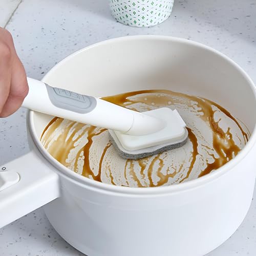 - Easy to use: The handle of the brush has a built-in detergent reservoir that can be easily dispensed with a simple press. This feature minimizes dishwashing detergent waste, ensuring you only use the right amount, while keeping your hands perfectly clean and dry during use.