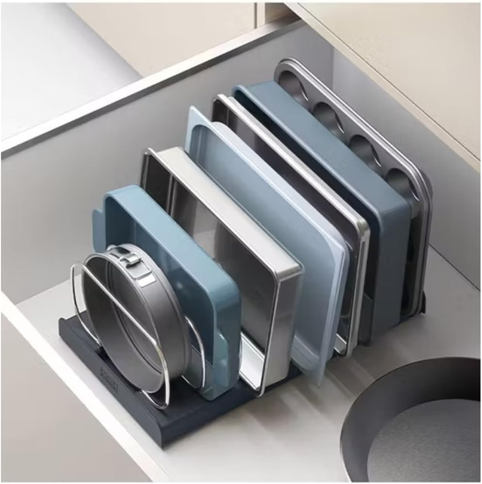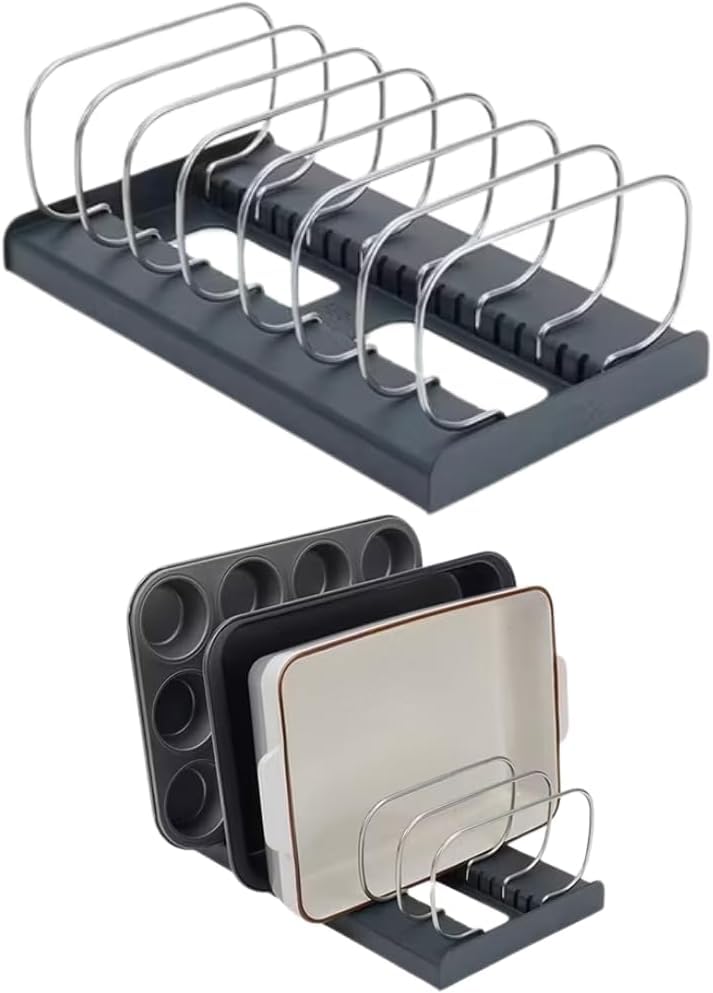 - VERSATILE ORGANIZATION: Adjustable rack with 7 compartments perfect for storing baking sheets, cutting boards, muffin tins, and other cookware items