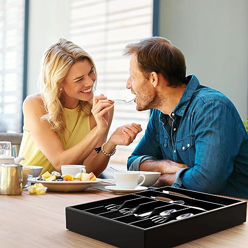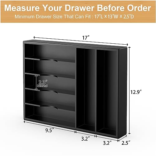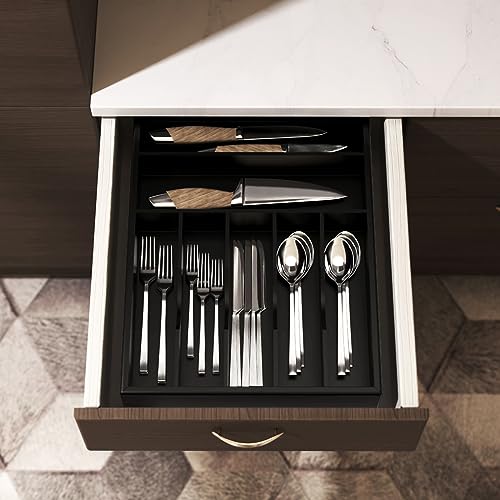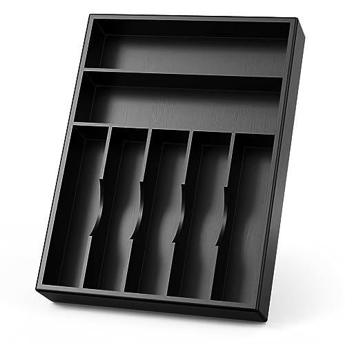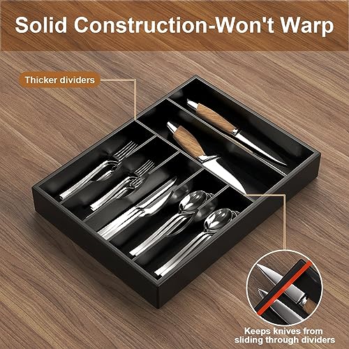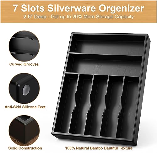 NIKUY - منظم أدراج المطبخ من البامبو- حامل صينية أدوات فضية مقاس 33 سم مع مقسم أدراج عميق للغاية- علبة من خشب البامبو مكونة من 7 فتحات لسكاكين أدوات المائدة والشوك والمعالق (أسود)