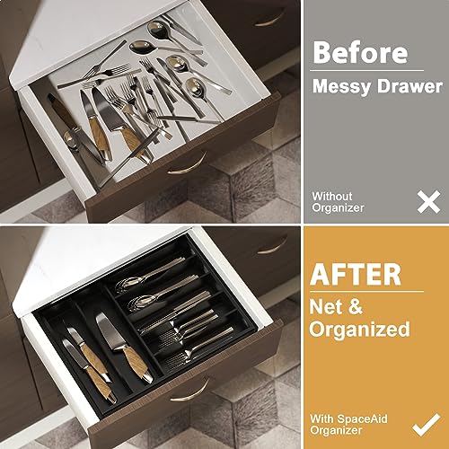 - مقاس مثالي 43 سم × 33 سم: نوصي بشدة بقياس الدرج الخاص بك قبل الطلب. عمق 6.35 سم، يوفر سعة تخزين أكبر بنسبة تصل إلى 20 % من المنظمات العميقة الأخرى مقاس 5 سم. 5 فتحات أفقية للشوك والسكاكين والمعالق وفتحتين أفقيتين أكبر لأواني المطبخ الأكبر مثل المغرفة وملعقة سباتولا ومساكة الطعام وأكثر من ذلك.
