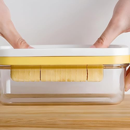 - This easy-to-use butter holder not only secures your butter for storage but can also serve as a convenient slicer. Simply place the butter block under the lid and press down to slice effortlessly. Designed to accommodate a variety of butter shapes and sizes, the highly transparent material showcases the butter content, enhancing organization in your kitchen or dining area. It not only keeps surfaces tidy but also adds instant comfort to your family life, making your butter usage more efficient.