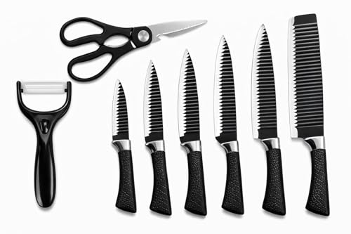 Generic - طقم سكاكين طبخ للمطبخ من 6 قطع - سكين شيف من الستانلس ستيل وساطور وسكاكين متعددة الاستخدامات ومقشرة خضروات ومقص مع مقبض مريح وصندوق تخزين للاستخدام اليومي في المطبخ