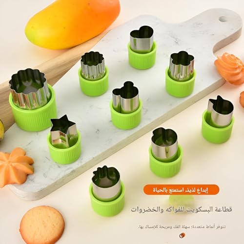 - Designed for safety and ease, this cookie cutter set features non-slip green handles made of high-grade stainless steel, making it simple and secure to press and release different shapes. The removable, dishwasher-safe cutters allow quick cleaning, while the variety of nine shapes inspires creativity in food presentation. Ideal for creating fun fruit and vegetable slices, these cutters turn ordinary ingredients into exciting elements for children's lunchboxes, party decorations, or themed desser
