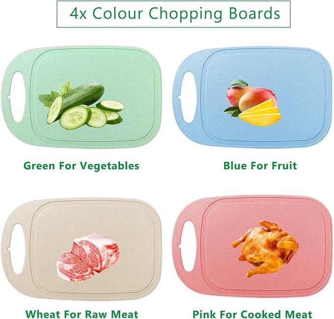 - مجموعة متعددة الاستخدامات: عبوة من 4 ألواح تقطيع بألوان نابضة بالحياة - أخضر مينت وأزرق وبيج وزهري، مثالية لتنظيم تحضير الطعام ومنع انتقال التلوث
