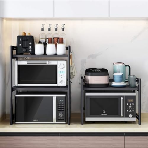 N / A - رف تخزين فرن الميكروويف للمطبخ، ارتفاع قابل للتعديل، منظم من خليط معدني من الالومنيوم عالي القوة والصلب الكربوني يوضع على الطاولة بـ 3 خطاطيف لتنظيم المطبخ والاطباق اليومية والتوابل