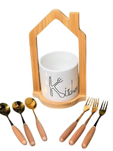 - This utensil holder comes with a complete 6-piece spoon and fork set, including three forks and three spoons, and a durable porcelain stand. It provides an all-in-one solution for those who want both storage and ready-to-use flatware in one stylish package.
