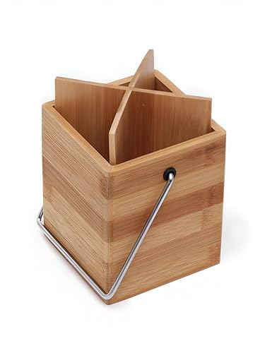 - Designed with a square wooden bamboo structure, this utensil caddy offers an elegant and natural aesthetic that seamlessly complements various kitchen décors, making it both functional and visually appealing.