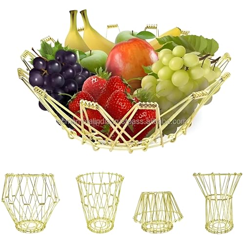 Generic - منظم المطبخ - حل تخزين الفواكه والخضروات المعدني الحديث من الستانلس ستيل، وعاء مزخرف مرن للتقديم او العرض، قطعة واحدة بلمسة نهائية ذهبية لسطح الطاولة الانيقة