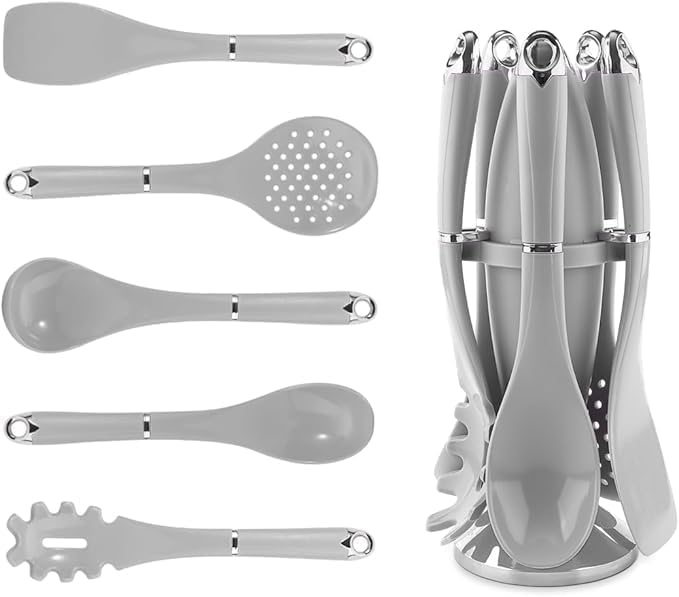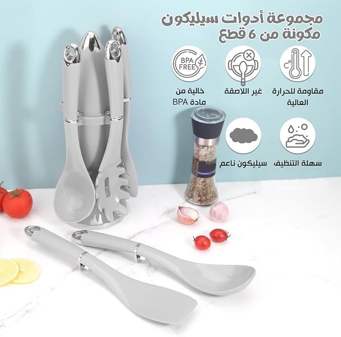 Generic - طقم ادوات مطبخ من السيليكون مكون من 6 قطع مع حامل - ادوات طبخ مقاومة للحرارة - اواني طهي غير لاصقة امنة للاستخدام في غسالة الصحون (رمادي)