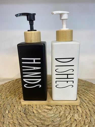 - Soap Dispenser Set: Includes two pump bottles - one black "HANDS" and one white "DISHES" with wooden base for elegant organization