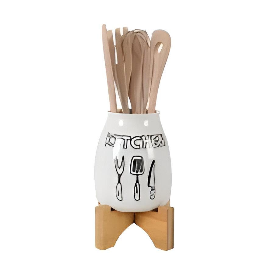 - A sleek porcelain utensil drainer with a natural bamboo holder that keeps spoons, forks, and knives neatly organized while adding a stylish, space saving touch to your kitchen.