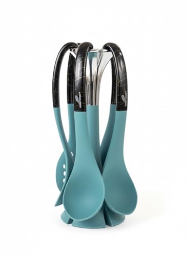 - COMPLETE SET: 6-piece kitchen utensil set includes slotted spoon, solid spoon, spatula, slotted turner, ladle, and pasta server in elegant teal colour